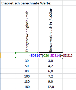 Durch den Anstieg der Regressionsgeraden und die Mittelwerte der beiden Datenreihen kann man mit den Ausgangswerten der Geschwindigkeit die Werte errechnen, die die Regressionsgerade an den zu berechnenden Stellen hat. Die Werte weichen von den tatsächlichen Werten ab, veranschaulichen jedoch gut, dass die Regressionsgerade nur näherungsweise die tatsächlichen Werte wiedergibt. Die theoretischen Werte kann man mit der rechts stehenden Funktion berechnen. Dabei bedeuten: